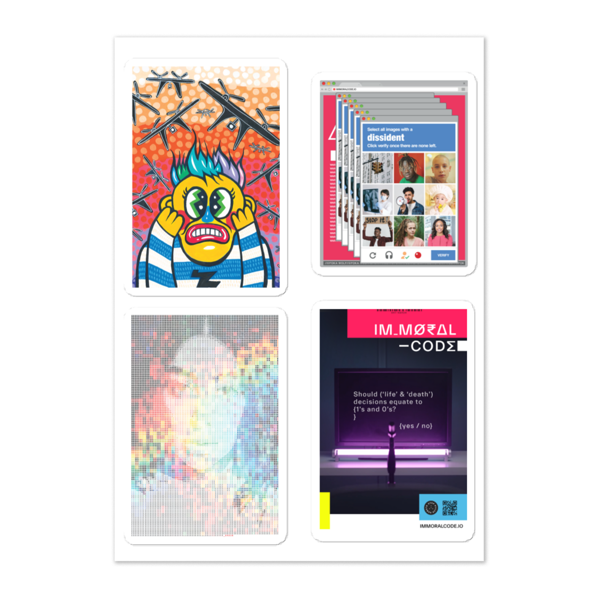 To illustrate how the subject of killer robots is a profoundly human problem, we commissioned a series of artists to give us their take on the issues presented in our documentary film Immoral Code. We've turned their art into awesome must-have stickers!